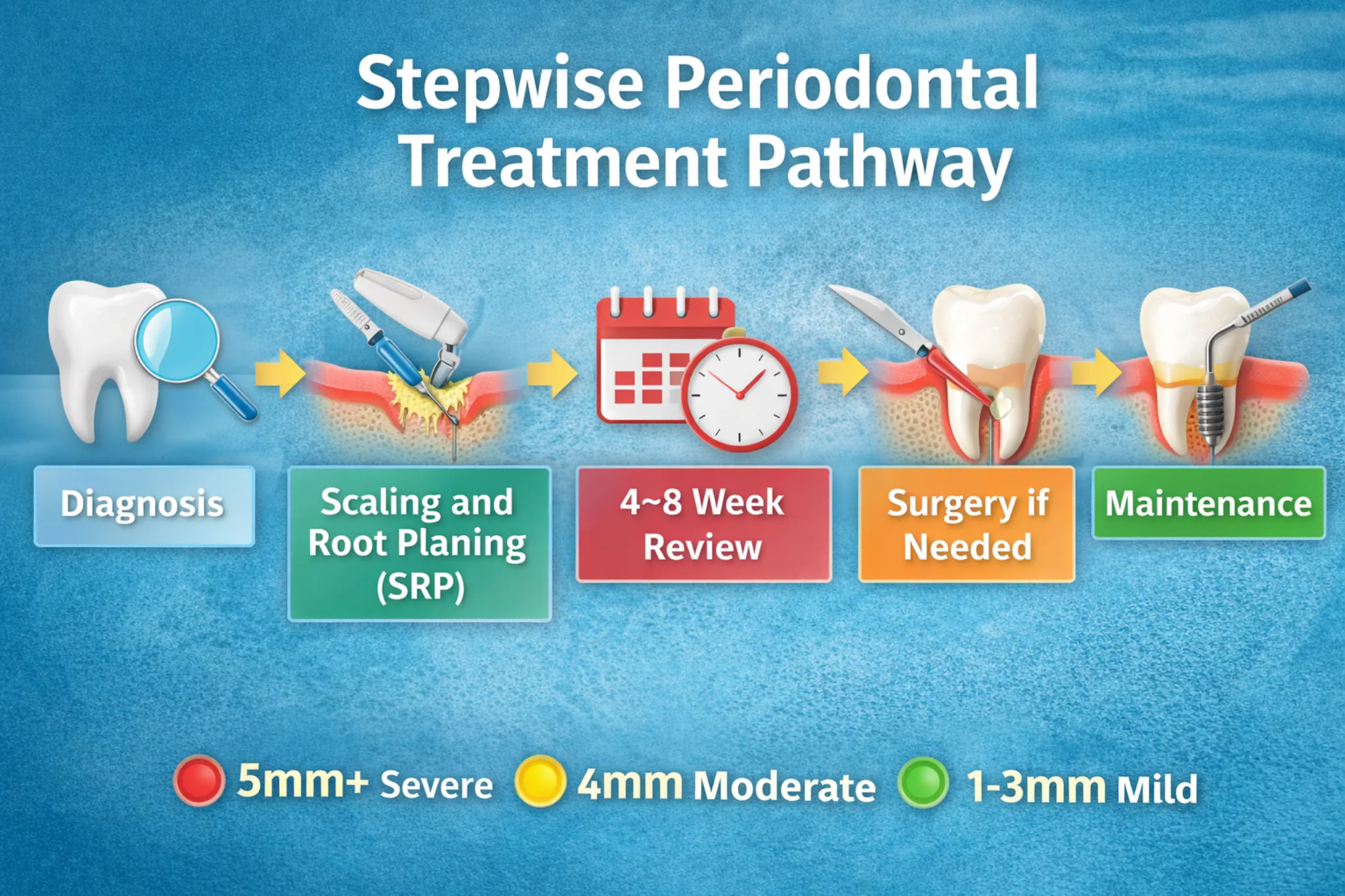 - If periodontitis is diagnosed, start SRP (deep cleaning) and schedule a re-evaluation in 4–8 weeks.